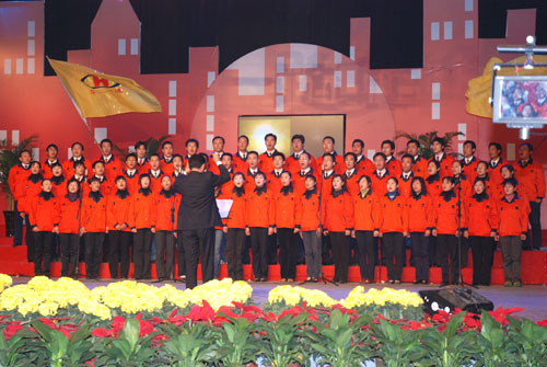 華珠公司合唱團(tuán)全體人員,市歌舞團(tuán)全體演員共同演唱《感恩的心》,聯(lián)歡會(huì)落下帷幕