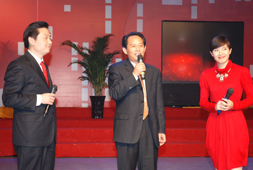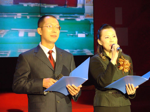 聯(lián)歡會(huì)主持人王鐵軍、閆虹共同邀請(qǐng)韓總經(jīng)理上臺(tái)表演節(jié)目